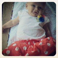 Last week we went to the doctor again. Not for more shots--that isn't for another month. I decided I needed to take her in because I decided something just wasn't right. She was doing mass amounts of spitting up (mouth and nose) along with arching her back and crying. It was obvious it hurt her and I was so done! I went in thinking they probably won't have much to tell me, and came out excited that my baby might be happier within only a matter of hours! Turns out she has GERD a.k.a reflux. So she now takes medicine in her bottle (because I figured out after she gagged herself into vomiting that it tasted HORRIBLE-I will from now on be tasting liquid meds before I give them to her I decided! what a mess it made!) twice a day. Also, they decided that maybe her other issues weren't truly an allergic reaction, but just from having reflux. She is now back on regular Enfamil formula that is lactose, but the A.R. which stands for added rice so she can keep it down easier. And guess what... IT WORKS WONDERS! She is a totally new baby. Hardly any spit up (one day she got to spend the WHOLE day in the same outfit because she only spit up ONCE!) and no more cries when she does.